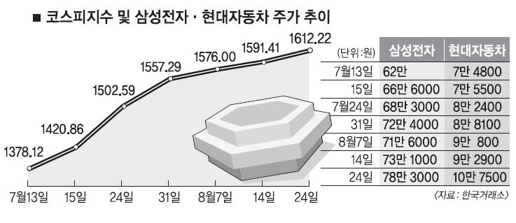 24일 코스피지수 1600선 돌파를 계기로 추가 상승에 대한 기대감도 커지고 있다. 최근 주식시장은 정보기술(IT)과 자동차가 이끄는 ‘양강 체제’라고 해도 지나친 말이 아니다. 업종 대표주인 삼성전자와 현대자동차의 상승세가 두드러진다. 때문에 향후 추가 상승 여부도 대형주의 움직임에 달려 있다는 분석이다.현대차 주가는 이미 증권사 목표주가를 넘어섰다. 현재 증권사들이 제시한 현대차의 목표주가는 평균 9만 9000원 안팎이지만, 이날 종가는 10만 7500원으로 사상 최고가를 이틀 연속 갈아치웠다. 삼성전자 주가 역시 78만 3000원으로 역대 최고가를 경신했다.