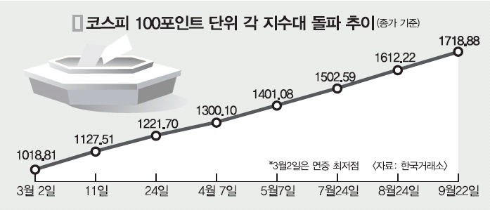 22일 코스피지수는 21일에 비해 23.38포인트(1.38%) 오른 1718.88로 거래를 마쳤다. 앞서 지난 17일과 18일, 21일 장중 한때 1700선을 돌파했지만 종가 기준으로 1700선을 넘어선 것은 지난해 6월26일 1717.66 이후 15개월여 만에 처음이다.