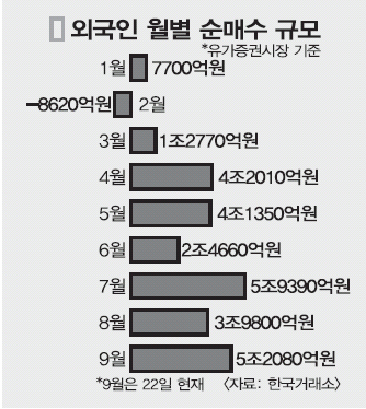 때문에 올 들어 외국인은 국내 증시에서 24조 8600억원을 순매수했다. 반면 기관은 펀드 환매 압력을 받으면서 23조 8100억원을 순매도했다. 외국인 매수세가 약화될 경우 펀드 환매 부담이 상대적으로 커져 지수가 하락 압력을 받을 가능성도 배제할 수 없다.