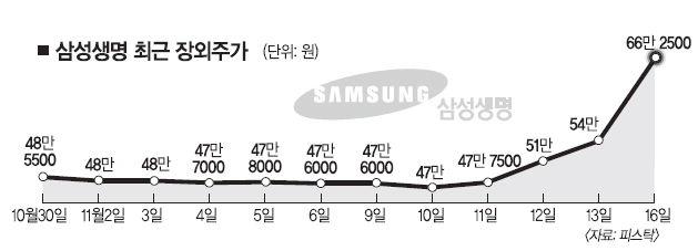 시장 반응은 즉각적이다. 장외시장에서 47만원대에 머물던 삼성생명 주가는 이날 상장 소식이 알려지면서 20% 이상의 폭발적인 상승률을 보였다. 전거래일에 비해 12만 2500원(22.69%) 오른 65만 5000원을 기록했다. 삼성생명 지분을 보유하고 있는 CJ제일제당(4.8%), CJ(3.5%), 신세계(13.6%) 등의 주가도 상승세를 기록했다.