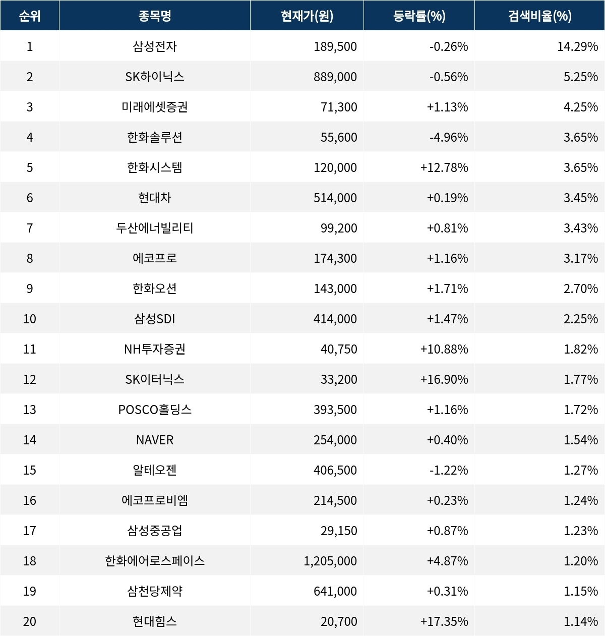 이어 SK하이닉스(000660)가 검색비율 2위를 기록하며 0.56%의 하락세를 기록하고 있다. 검색비율 3위의 미래에셋증권(006800)은 1.13% 상승하며 순조롭게 출발하는 모습이다. 검색비율 4위 한화솔루션(009830)은 개장 초반부터 4.96%의 하락률로 주가가 하락 중이다. 검색비율 5위 한화시스템(272210)은 12.78%의 급등세를 보이고 있다.