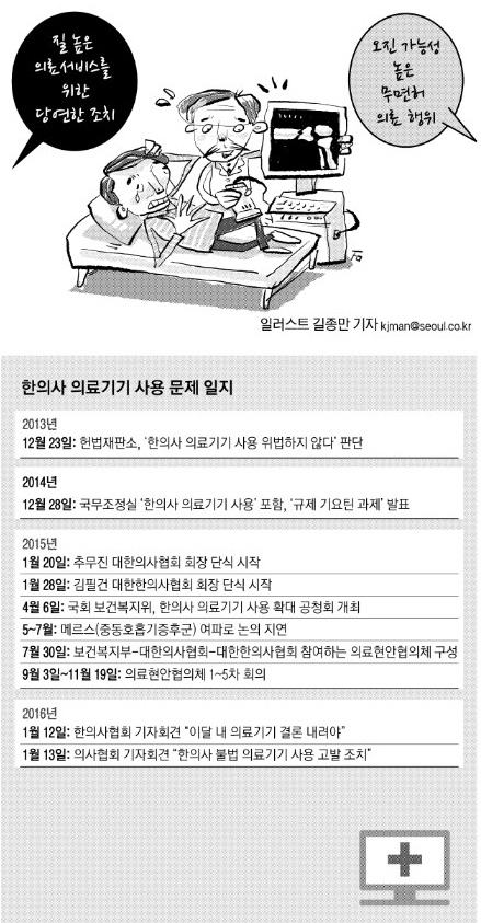직능단체인 의사협회의 반발은 당연한 일이다. 한의사가 의료기기를 사용하면 양의사는 그간 진단용 의료기기를 독점해 얻은 이익과 기득권을 잃어버리게 된다. 의사협회는 치과의사, 간호사, 약사, 물리치료사, 안경사, 문신사 등과도 갈등을 빚고 있다. 환자의 권익을 보호하기 위한 이른바 ‘신해철법’(의료분쟁 조정절차 자동개시제도)이나 수술실 폐쇄회로(CC)TV 설치 법안에도 강력히 반발하고 있다. 양의사들이 반대한다는 이유로 이런 문제를 모두 밥그릇 싸움으로 치부할 수는 없다.