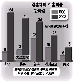 일생 동안 결혼은 한 번으로 족하다는 얘기는 옛말이 된 지 오래다.특히 남성우월주의와 유교적 가부장제가 강한 아시아 국가들에서도 ‘이혼=흠’이라는 등식은 더 이상 통하지 않는다.미국의 시사주간지 타임은 아시아판 최신호에서 최근 10년새 급증한 아시아에서의 이혼율 급증 추세와 원인 등을 자세히 소개했다.