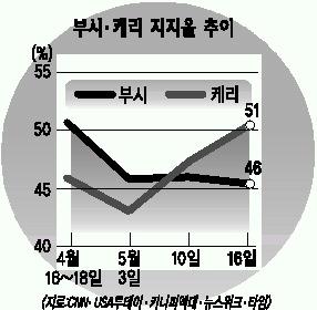 |워싱턴 백문일특파원|민주당 대선 후보인 존 케리 상원의원이 최근 여론조사에서 공화당의 조지 W 부시 대통령을 앞선 것으로 나타났다.그러나 오차한계 범위에서의 ‘리드’로 케리 후보가 선전했다기보다는 포로학대 문제로 더욱 악화된 이라크사태 등 갖은 악재에 직면한 부시 대통령이 바닥을 긴 측면이 강하다.