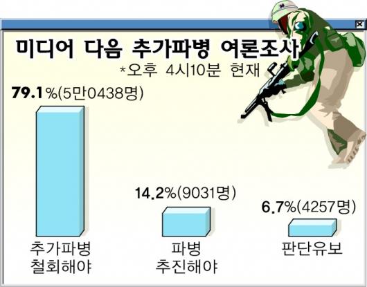 네티즌도 뜨거운 공방을 벌였다.포털사이트 다음이 이날 실시한 추가파병 여론조사에서 78.7%가 “자국민 보호가 우선이다.당장 추가파병을 철회해야 한다.”고 대답한 반면 “파병추진”은 14.4%에 불과했다.