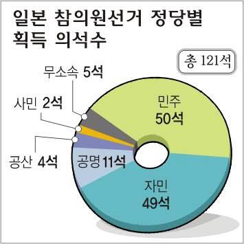 |도쿄 이춘규특파원|11일 치러진 일본 참의원선거에서 집권 자민당은 스스로 승패 기준으로 제시했던 기존 51석을 밑도는 49석을 얻는 데 그쳐 패했다.반면 12일 최종 확인된 집계결과에 따르면 자민당과 같은 보수성향의 민주당은 기존 38석에서 50석으로 늘리는 대약진을 했다.야당이 개선 의석 수에서 제1당이 되기는 1989년 사회당(당시) 이래 15년만이다.