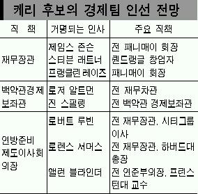 케리 후보가 경제분야의 가장 중요한 자리인 재무장관에 월스트리트 출신을 선호하는 것은 빌 클린턴 전 대통령이 골드만 삭스 회장이었던 로버트 루빈 등을 영입해 성공했던 경험을 ‘벤치마킹’한 것이다.월가 출신이 활약한 클린턴 행정부 당시 뉴욕의 증시는 3000선에서 1만 1000선까지 오르는 사상최고의 비약적 성장을 이뤘다.케리 후보는 지난달말 열린 전당대회와 그 이전의 유세를 통해 “클린턴 정부 당시의 경제번영을 되살리겠다.”고 말해왔다.