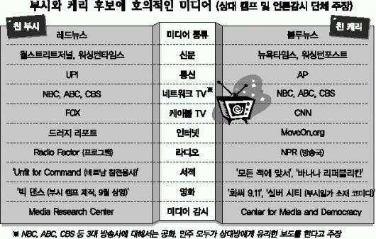 특히 이번 선거가 한표 한표를 다투는 접전으로 전개되자 양당은 신문·방송 등 전통적인 선거 미디어는 물론 인터넷과 라디오·출판·음악·영화 등 멀티미디어까지 총동원,부동층을 흡수하고 상대 후보를 공격하는 데 열을 올리고 있다.미디어도 조지 W 부시 대통령에게 호의적인 ‘레드 뉴스’와 존 케리 민주당 후보와 성향이 같은 ‘블루 뉴스’로 나뉘어 치열한 ‘색깔 전쟁’을 하고 있다.이 때문에 두 당의 선거캠프 관계자들이 상대방 후보를 흠집내는 내용의 ‘첩보’를 호의적인 매체에 건네주면,이를 크게 보도하는 관례도 이어지고 있다.