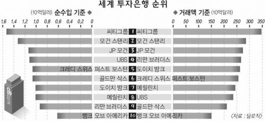 세계 투자은행들의 실적 평가결과 씨티그룹과 모건스탠리,JP모건이 매출액과 순수입 분야에서 모두 나란히 1,2,3위를 차지한 것으로 나타났다.