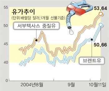잇따른 악재로 원유공급 불안 우려가 계속되는 가운데 국제유가가 연일 사상최고치를 깨고 있다.서부텍사스중질유(WTI) 선물가격은 12일 배럴당 54달러를 돌파했고,북해산 브렌트유는 사상 처음 51달러를 넘어섰다.