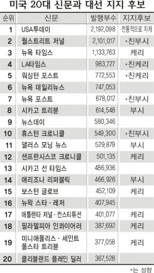 민주당 케리 후보가 17개 신문의 지지를 얻어 8개 신문의 지지를 획득한 공화당의 조지 W 부시 대통령과의 ‘신문 전쟁’에서는 승리했지만, 신문의 지지가 독자의 투표에 어느 정도 영향을 미칠지는 불투명하다.