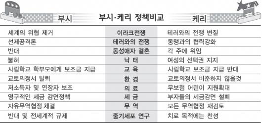 슬로건은 크게 다르지 않았다. 조지 W 부시 대통령은 ‘희망찬 21세기’를 내걸었고 존 케리 후보는 ‘보다 나은 미국인의 삶’으로 정했다. 그러나 9·11 이후 미국의 대내외 정책을 바라보는 시각은 크게 엇갈렸다.