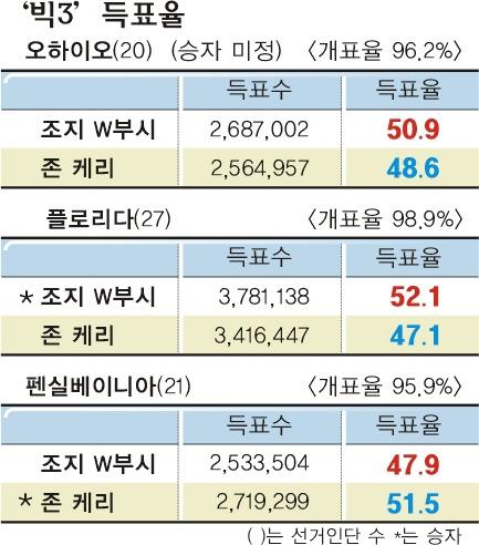 공화당 후보인 부시 대통령은 2일(현지시간) 치러진 대통령 선거에서 최고의 접전지역이었던 플로리다와 오하이오 주에서 승리를 거둬 민주당의 존 케리 후보를 눌렀다.