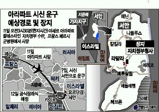 야세르 아라파트 팔레스타인 자치정부 수반의 장례식은 12일(현지시간) 이집트 카이로 국제공항 내 이슬람 사원에서 치러질 예정이다. 팔레스타인측이 이집트 정부의 제안을 받아들여 카이로에서 장례를 먼저 치른 뒤 곧바로 장소를 이동해 요르단강 서안 라말라 자치정부 청사에 고인을 안장키로 한 데는 몇 가지 요인들이 얽혀 있다.