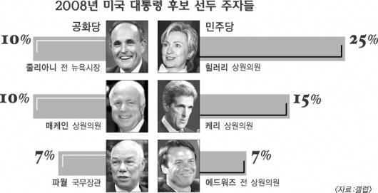 |워싱턴 이도운특파원|미국의 민주당원은 힐러리 클린턴 뉴욕주 상원의원을, 공화당원은 루돌프 줄리아니 전 뉴욕시장을 2008년 대통령 후보로 꼽았다.