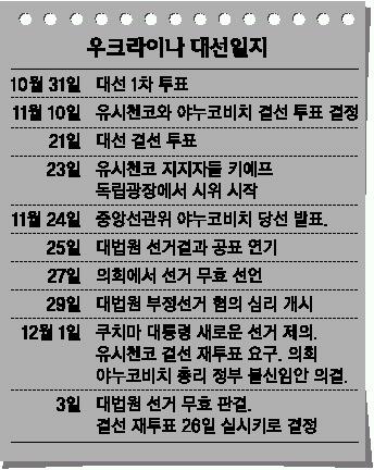 우크라이나 중앙선거관리위원회가 오는 26일(현지시간) 대통령선거 결선투표를 다시 실시한다고 4일 밝혔다. 여당 후보 빅토르 야누코비치 총리가 당선된 것으로 나타난 지난달 21일 결선투표 결과에 대해 3일 대법원이 무효 판결을 내리면서 대규모 시위를 불러온 부정선거 파문이 재투표 실시로 일단락됐다. 하지만 선거의 공정성을 위해 야당이 요구한 선거법 개정안에 대해 여당이 대통령 권한 축소를 뼈대로 한 헌법 개정안 요구로 맞불을 놓고 있어 이 문제가 최대 쟁점으로 급부상하고 있다.