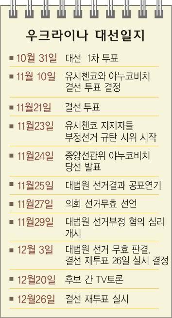 지난달 21일 대선 결선 투표 결과, 여당 후보인 빅토르 야누코비치 총리가 당선됐지만 야당의 빅토르 유시첸코 후보측이 선거 부정 의혹을 제기하고 서방 진영이 이에 동조하면서 동서분열 등 선거 후유증을 앓았다. 더욱이 이 과정에서 러시아는 야누코비치 후보 편을 들어 미국·유럽 대 러시아의 ‘힘겨루기’ 양상을 띠기도 했다. 결국 우크라이나 대법원이 선거 무효 판결을 내렸고 이날 재투표가 실시된 것이다.