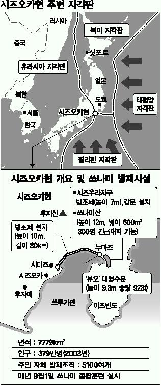|시즈오카 이춘규특파원|인구 379만명(2003년 기준)이 밀집한 시즈오카현은 유라시아지각판, 필리핀지각판, 북미지각판 등 3개의 이른바 지각판이 충돌하는 지역이다. 그래서 100∼150년을 주기로 거대지진이 일어났다. 특히 500㎞ 이상의 해안선 연안지역에 인구가 밀집, 지난해 말 남아시아 쓰나미 피해 이후 이 지역의 쓰나미 대책이 크게 주목받고 있다.
