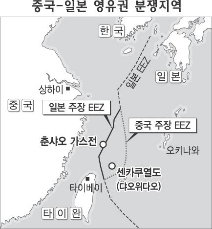 중국과 일본에 걸쳐있는 동중국해 수역은 폭이 400해리에 못미쳐 자국 연안에서 200해리까지 설정할 수 있는 배타적경제수역(EEZ)이 겹쳐 있는 데다 중국이 춘샤오(春曉) 가스전 일대에서 독자개발에 나서면서 양국간 갈등이 불거졌다.