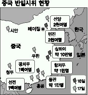 |베이징 오일만·도쿄 이춘규특파원|일본의 역사 왜곡과 영토 분쟁으로 촉발된 중국의 반일시위가 16,17일 양일간 중국 전역과 홍콩으로 급속히 확산되고 있다.