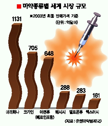 세계 전체 마약 시장규모는 연 3220억달러(약 335조원), 마약 생산량은 약 4만t에 달했다.2003년 각국 정부가 압수량 마약의 총량은 1985년에 비해 4배나 늘어났다. 코스타 국장은 “모든 지표를 종합해 볼 때 마약시장이 더 확대될 것은 분명하다.”면서 “마약 밀매가 인류의 삶에 커다란 영향을 미치고 있다.”고 지적했다.