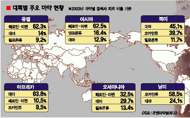 남미지역에서는 전체 마약치료자 가운데 코카인 중독자가 58.5%를 차지했고, 유럽과 아시아 지역에서는 헤로인 등 아편류 복용자가 전체 마약치료자의 약 62%였다. 특히 코카인은 복용자가 전년보다 조금 줄어든 반면 헤로인은 전년보다 140만명이나 늘어 심각성을 더하고 있다.