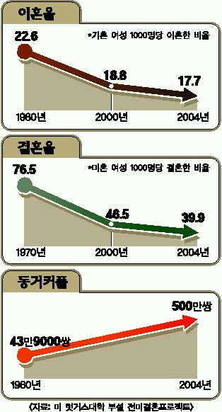 결혼 대신 동거하는 커플이 늘면서 세계에서 이혼율이 높은 국가 가운데 하나인 미국에서 최근 들어 이혼이 줄고 있다고 미국 럿거스대학 부설 ‘전미결혼프로젝트’가 18일(현지시간) 밝혔다. 이 연구소의 데이비드 포페노 교수는 그러나 동거 커플이 결혼한 부부보다 갈라설 가능성이 훨씬 높고, 이들 가운데 절반가량이 자녀를 두고 있어 동거의 증가는 이혼율 증가보다 더 큰 사회적 문제가 될 수 있다고 지적했다.
