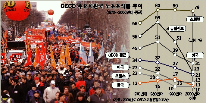 경제협력개발기구(OECD) 대표부의 정형우 노무관은 유럽의 노조세력이 약화되고 있는 결정적인 원인으로 세계화에 따른 경쟁 심화를 꼽았다. 정 노무관은 “글로벌 경쟁환경에서 기업이 탄력적으로 변화에 대응하기 위해 기존 산별교섭보다는 개별 기업의 특수성을 감안한 노사협상에 힘이 실리는 추세”라고 말했다. 프랑스가 주 35시간 근로제를 폐지하면서 연간 연장근로시간 한도를 180시간에서 220시간으로 늘리되 기업별로 노사합의 아래 그 이상도 가능하도록 한 것이 대표적인 사례다.
