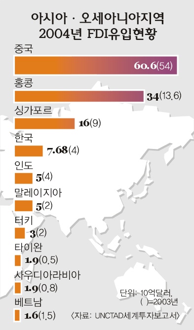 지난해 전세계 FDI 총액은 6481억달러로 전년도인 2003년보다 2% 늘어났다.