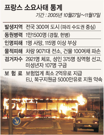 지난달 27일 파리 교외의 무슬림 빈민가에서 경찰의 검문을 피하던 10대 소년 2명이 감전사하면서 촉발된 이번 소요사태는 이민자 2·3세의 사회통합문제, 실업, 빈부차, 주택문제, 청소년 범죄 등 프랑스 사회가 안고있던 내부 모순이 한꺼번에 폭발했다. 프랑스의 대외이미지에 큰 타격을 입힌 이번 사태는 정부로 하여금 관련 정책들을 재정비해야 하는 과제를 안겨줬다.