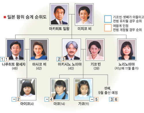 개정안의 골자는 ‘여왕·여계왕을 인정해 남녀를 불문하고 장자의 왕위 승계를 우선한다.’는 것이다. 임신 6주째인 것으로 7일 알려진 일왕의 둘째 며느리 기코 빈이 가을에 아들을 출산한다고 해도 남자 왕손은 한명뿐이고 공주 셋을 포함해도 왕손은 4명에 불과하다.