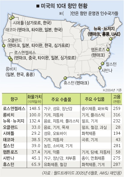 미국에서 가장 물동량이 많은 10개 항만의 운영권이 이미 한국과 중국, 타이완 등 외국 기업의 손에 들어가 있다고 아시안월스트리트저널이 10일 보도했다. 신문은 10개 항만의 컨테이너 중 60% 이상이 해외 업체에 의해 통제받고 있으며 심지어 일부 기업은 자국 정부가 장악한 경우도 있다고 지적했다. 신문은 중동계 기업의 미 항만 운영권 인수를 저지한 정치적 움직임이 항만 운송의 글로벌 추세에 역행하는 것이라고 꼬집었다.