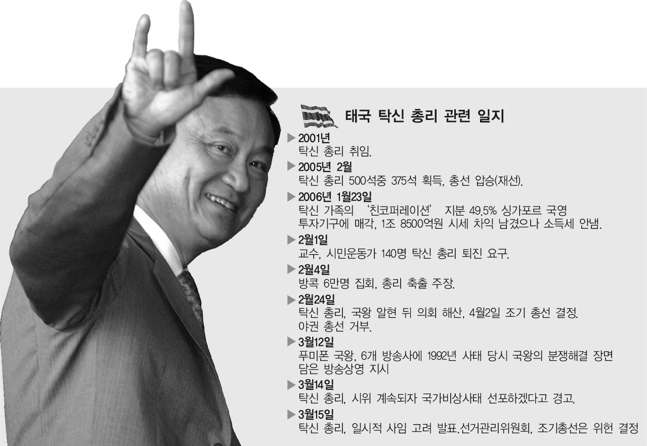 스스로 ‘CEO 총리’라고 일컬었던 탁신 친나왓(56) 태국 총리가 자신을 총리직에 오르게 했던 비즈니스와 정치의 결합 때문에 도중하차할 위기에 몰리고 있다.