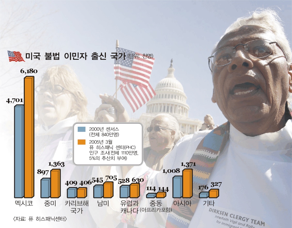 지난해 3월 현재 불법체류자는 1110만명으로 추정되고 있다. 불법체류자 처리문제를 놓고 최근 미국사회에 논란이 일고 있다.