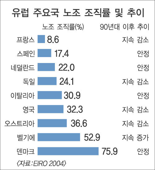 그들은 핫도그와 바게트, 풍선과 플래카드만으로도 도미니크 드 빌팽 프랑스 총리를 막다른 길로 압박하고 있다. ‘파업 천국’이라는 프랑스의 노조 조직률은 유럽에서 가장 낮은 8%에 불과하다. 그럼에도 막강한 힘을 발휘하고 있다.