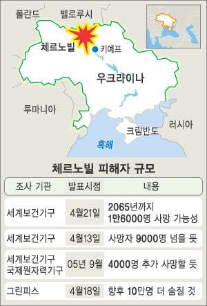 체르노빌 피해자 규모는 사고 당시 소련의 은폐와 주민 이주 등으로 정확한 집계가 없다. 국제 기구들의 조사 결과도 천차만별이다. 세계보건기구(WHO) 산하 국제암연구센터(CIRC)는 지난 21일 “앞으로 60년 동안 1만 6000명이 사망할 수 있다.”고 예측했다. 지난해 9월 WHO와 국제원자력기구(IAEA)가 발표한 4000명의 네 배 규모다.