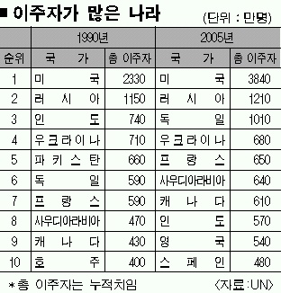모국을 떠나 외국에 사는 이주자는 2005년 현재 1억 9100만명이나 된다. 이 가운데 1억 1500만명은 선진국에,7500만명은 개발도상국가에 있다. 전 세계 이주자 5명 중 1명꼴은 미국에 살고 있다.