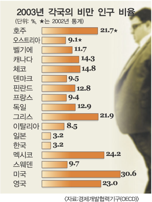 오는 2013년이면 미국 전체 인구 3억명 가운데 9000만명이 비만 판정을 받게 된다. 지난해 경제개발협력기구(OECD)의 통계에 따르면 1980년 미국의 성인 비만 인구는 2300만명(전체의 15%)에서 20년새 3배로 늘었다.2003년에는 30.6%까지 올랐다.