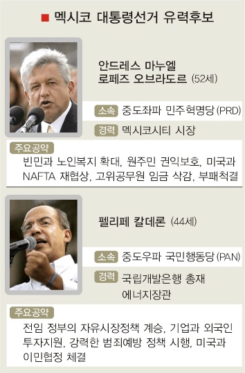 멕시코시티 시장을 지낸 안드레스 마누엘 로페스 오브라도르 민주혁명당 후보는 5000만명에 가까운 빈민층이 핵심 지지세력이다. 치열한 각축을 벌인 펠리페 칼데론 국민행동당 후보는 부유층과 기업인들의 절대적 지지를 업고 있다.