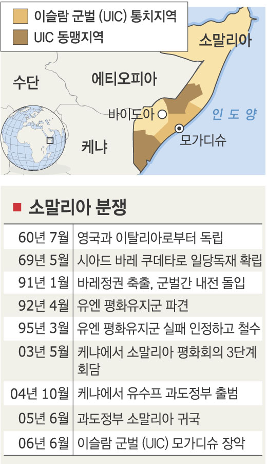 유엔이 정통성을 인정한 과도정부를 보호한다는 명목으로 에티오피아군 수천명이 국경을 넘어 진입하자 이슬람 군벌세력이 즉각 ‘지하드(聖戰)’를 선언하고 나선 것이다. 교전이 벌어지고 군벌세력을 지원해온 에티오피아의 ‘앙숙’ 에리트레아까지 개입한다면 동북아프리카가 전면전에 휘말리는 것도 시간문제다.