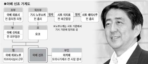 아베 신조는 1954년 기시 전 총리의 장녀 요코와 아베 신타로 전 외상 사이의 차남으로 태어났다. 그의 부인은 모리나가제과의 마쓰자키 아키오 전 사장 장녀 아키에(44)다. 아베 신조의 형 히로노부는 우시오 전기 회장의 장녀와 결혼하는 등 재계와의 연결고리도 튼튼하다.