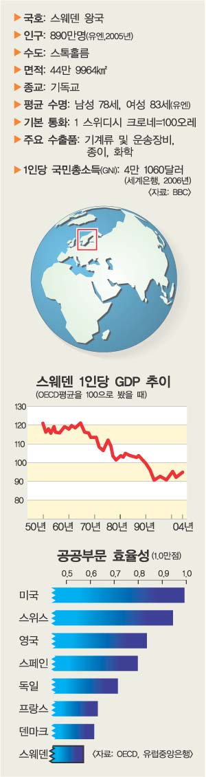 높은 세금(소득세율 30∼55%)으로 질 높은 공공 서비스와 복지 혜택 제공, 사회주의적 시장경제 체제와 자본주의 기업의 절묘한 결합, 중앙집중화된 임금 교섭, 피고용자의 30%가 공공 부문에 종사할 정도로 ‘큰 정부’ 지향…. 스칸디나비아 국가들조차 부러워해 온 스웨덴의 복지국가 모델이 중대한 기로에 놓여 있다.65년간 집권해온 사회민주당(SDP) 주도의 중도좌파연합이 17일 총선에서 우파중도연합에 정권을 내줄지도 모르는 위기에 빠져 있기 때문이다.
