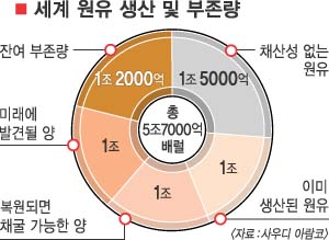 세계 최대 석유회사인 사우디아라비아 국영 ‘사우디 아람코’의 압달라 주마 최고경영자(CEO)는 오스트리아 빈에서 열린 석유수출국기구(OPEC) 세미나에서 앞으로 140년 이상은 원유를 채굴할 수 있을 것으로 예측했다고 아시안 월스트리트저널(AWSJ)이 14일 보도했다. 주마 CEO에 따르면 지금까지 생산된 원유는 지구에 묻혀 있는 총 5조 7000억배럴 가운데 18% 정도인 1조배럴뿐이며 현재 생산 기술을 고려할 때 남은 4조 5000억배럴 이상을 140년 넘게 퍼낼 수 있다고 단언했다.