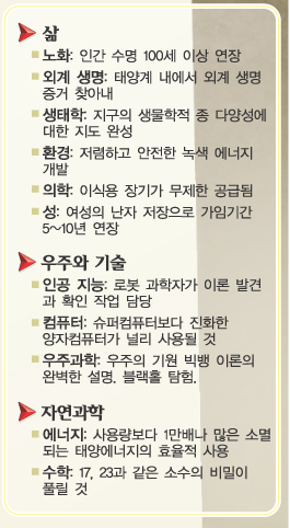 앞으로 50년 뒤에는 우주에서 또 다른 생명체를 확인하게 될 것이며, 인간의 수명은 100세 이상으로 늘게 될 것이다.