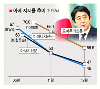 |도쿄 이춘규특파원|일본 아베 신조 총리 정권이 출범 3개월도 안돼 지지율이 큰 폭으로 하락하고 있는 가운데 정부 주도의 ‘여론조작’ 파문이 불거지면서 뒤뚱거리고 있다.