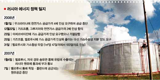 러시아는 2003년 ‘에너지전략 2020’을 수립했다. 골자는 국내 에너지산업에 대한 국가통제권을 강화하면서 대외적으로 에너지를 통한 영향력을 극대화한다는 것. 이에 따라 2004년 국영 로스네프트(석유)사는 러시아 민영 1위 유코스사를, 국영 가즈프롬(가스)은 러시아 5위 시브네프트사를 각각 인수하면서 사실상의 국유화 체제를 갖췄다. 이후 ‘자원 무기화’에 박차를 가했다. 우크라이나에 이어 그루지야, 벨로루시 등이 울며 겨자먹기식으로 천연가스 공급가격 인상을 받아들였다.