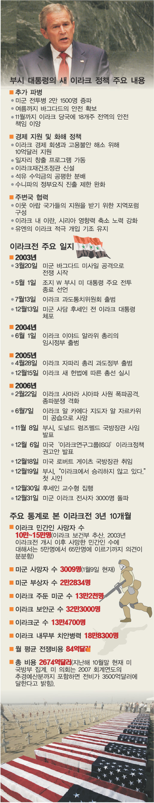조지 W 부시 대통령이 10일 TV 연설을 통해 밝힌 새로운 이라크 정책의 핵심은 ▲병력 증파를 통한 바그다드 장악 ▲재건 예산 지원 등을 통한 이라크인들의 마음 잡기 ▲국제적인 협력 강화라고 할 수 있다. 그러나 부시 대통령이 ‘승부수’로 던진 새로운 정책은 기본적으로 미국인 다수의 기대와는 방향이 다른데다가 국제적인 협력도 얻기 어려운 상황이어서 현실화되려면 적지 않은 난관을 극복해야 할 것으로 보인다. 프랑스, 러시아 등 주요 유럽국가들도 냉담한 반응을 보냈다.