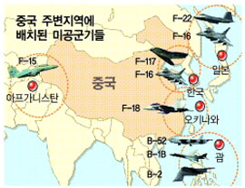 주한미군은 미 공군 제7항모대 예하 전투기가 서울 이남 61㎞에 위치한 오산 공군기지 등에 집중 배치돼 있고, 주일미군은 F-18을 주력기로 하는 제5항공대가 오키나와 기지 등에 산재돼 있다고 구체적으로 밝히고 있다. 이같은 보도는 최근 중국이 기상 위성을 미사일로 요격한 뒤 중국 위험론을 제기하고 있는 서방 언론의 보도 등에 맞서기 위한 것으로 풀이된다.