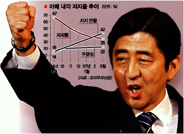 그러나 출범 초기의 화려함은 그리 오래 가지 못했다. 국민들의 피부에 와닿는 노동·복지 등 생활 분야가 아닌 정치 문제에만 매달린 탓이라는 게 일본 언론들의 대체적인 분석이다. 아베 총리의 실언과 ‘밀어붙이기식’ 정국 운영, 각료들의 무책임한 발언, 개혁 정책의 후퇴도 민심을 떠나게 했다.