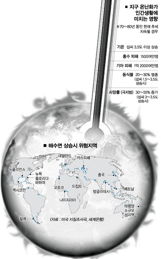 유엔 정부간 기후변화위원회(IPCC)가 6일(현지시간) 벨기에 브뤼셀에서 내린 경고음이다.IPCC는 5일 동안의 격론을 거쳐 이날 지구온난화가 현재 속도로 이어질 경우 닥칠 재앙을 담은 4차보고서 2권을 발표했다.